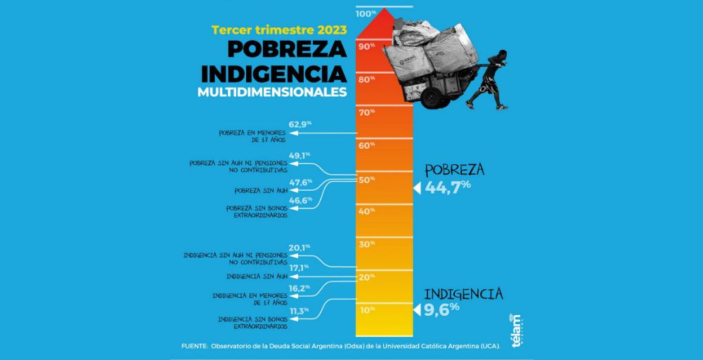La pobreza multidimensional urbana ascendió en el tercer trimestre de 2023 al 44,7% del total de la población y al 62,9% de los niños y adolescentes, de acuerdo con el informe dado a conocer el lunes por el Observatorio de la Deuda Social Argentina (ODSA) de la Universidad Católica Argentina (UCA).