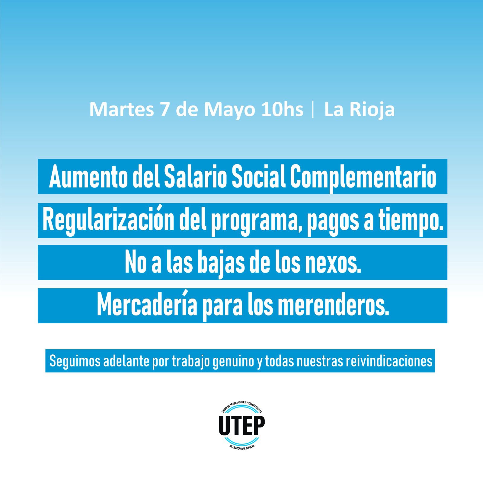 La UTEP La Rioja convoca a la movilización para este martes 7 “en contra de la quita y reducciones del Salario Social Complementario, la eliminación de la distribución de alimentos a los comedores comunitarios. En contra del congelamiento del Salario Mínimo Vital y Móvil y en defensa del Monotributo Social como herramienta de inclusión social”.