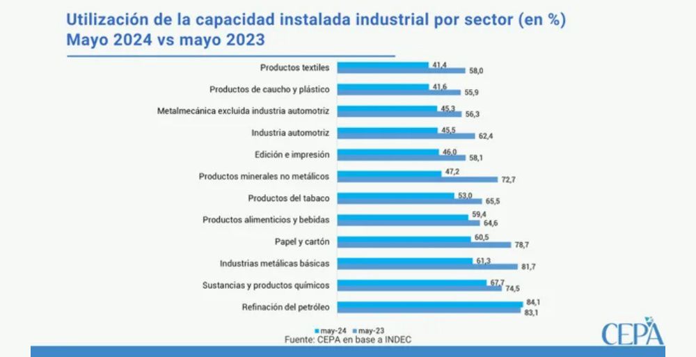 El 43% promedio de las líneas de producción de las plantas industriales en casi todos los sectores, salvo refinación del petróleo, se encuentra inactivo, transcurrido casi un semestre del año y del Gobierno de Javier Milei.