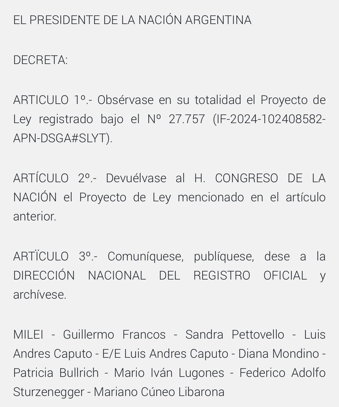 El veto del presidente Javier Milei a la ley de financiamiento universitario menciona entre sus fundamentos que “el proyecto de ley sancionado por el Congreso es manifiestamente violatorio del marco jurídico vigente, en tanto no contempla el impacto fiscal de la medida ni tampoco determina la fuente de su financiamiento”.