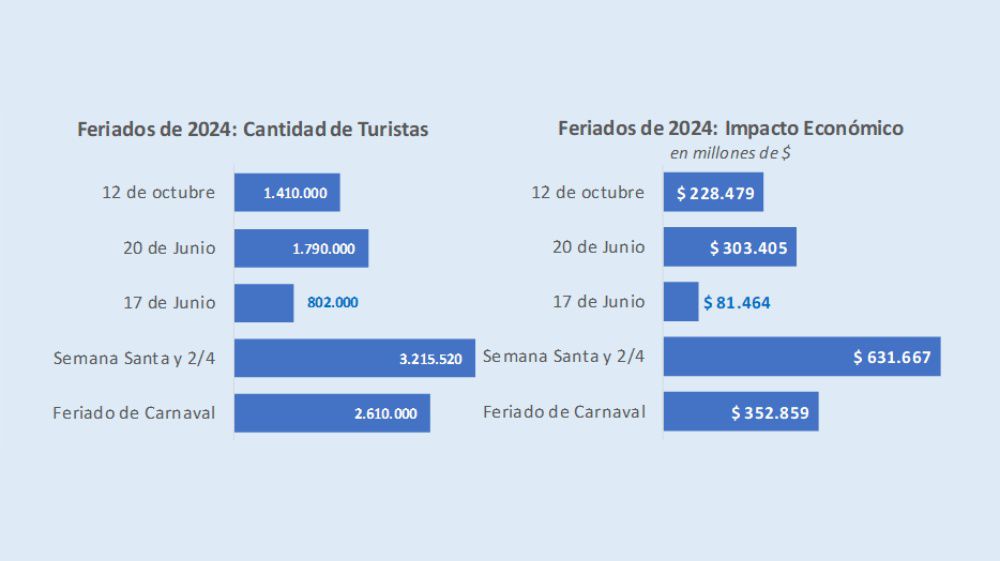 Frente al mismo fin de semana del año pasado, viajaron 7,1% menos de personas y el impacto económico tuvo una baja real de 33,3%. Esto se explica porque el feriado 2023 fue de cuatro días, y el tipo de cambio en aquel momento volvía a Argentina más conveniente para el visitante internacional.