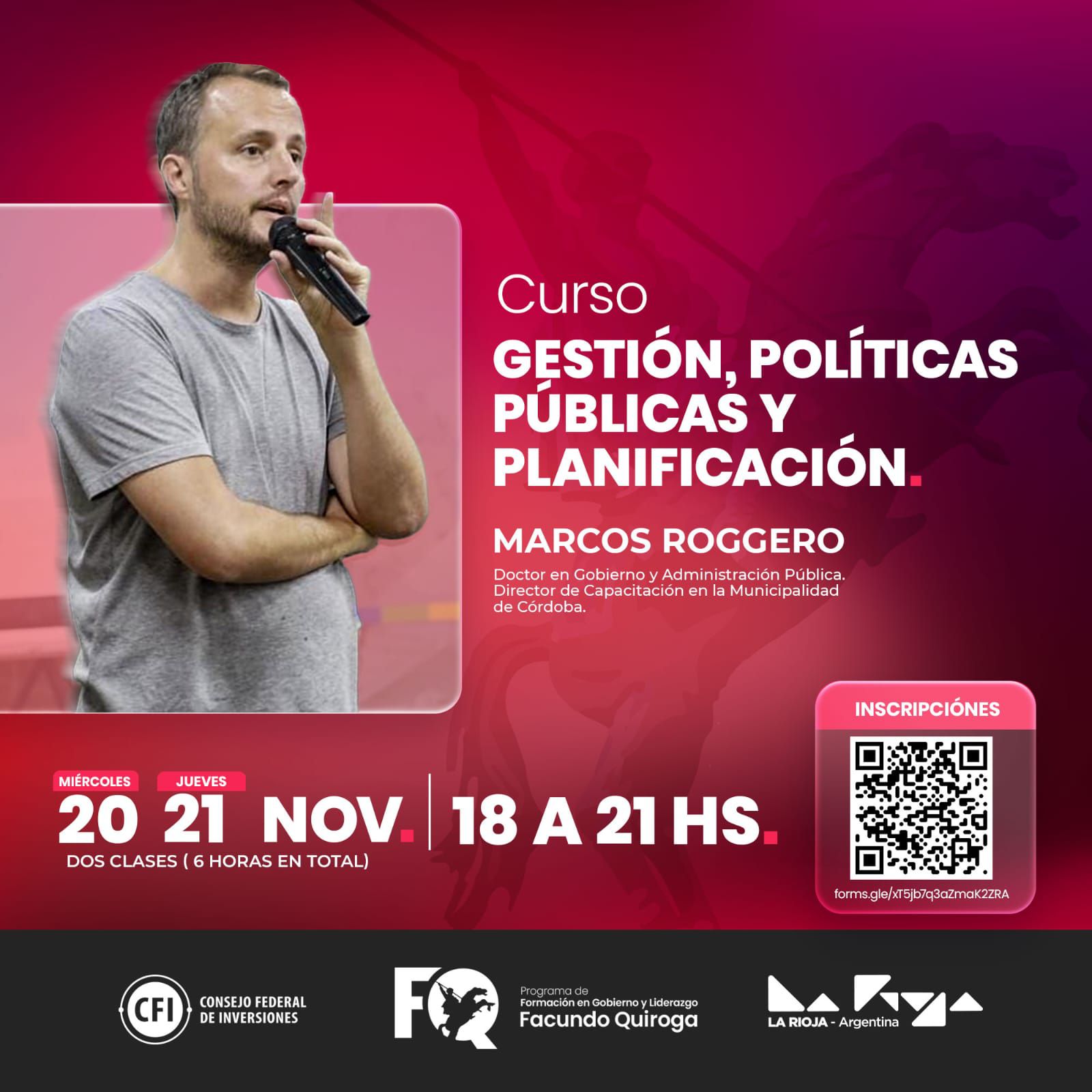 El 20 de noviembre inicia el curso de Gestión, Políticas Públicas y Planificación con una capacitación diseñada para fortalecer las habilidades en gestión pública y planificación estratégica que contará con la disertación de Marcos Roggero, Doctor en Gobierno y Administración Púbica. Será virtual de 18 a 21hs este 20 y 21 de noviembre.