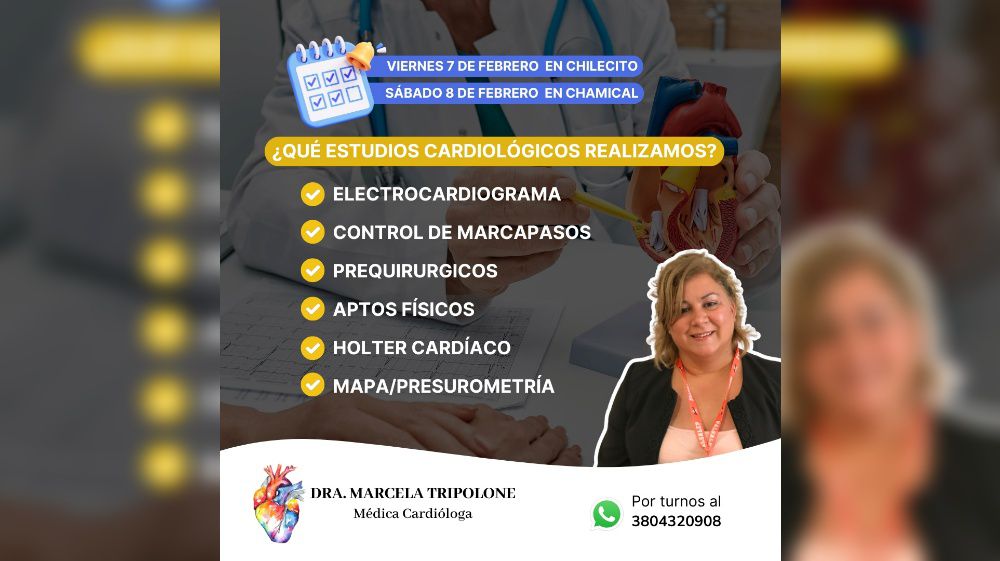 LA RIOJA.- La especialista en cardiología, doctora Marcela Tripolone, atenderá este sábado 7 de febrero en la ciudad de Chilecito, y el domingo 8 en la ciudad de Chamical.