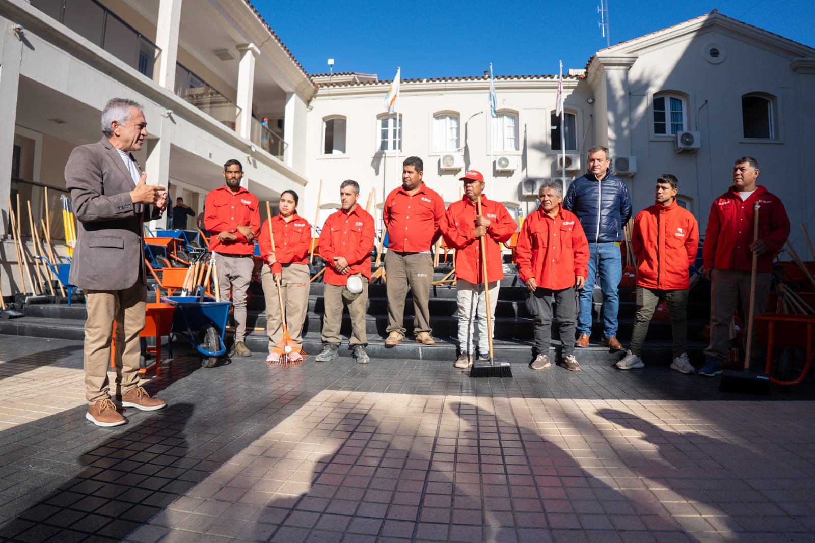 Dentro de los equipos entregados, se incluyen maquinaria liviana y herramientas de mano para tareas de limpieza: 60 cepillo barrendero, 60 rastrillos barre hojas, 43 palas anchas, 40 carretillas, 20 machetes y 20 podones de jardinería.