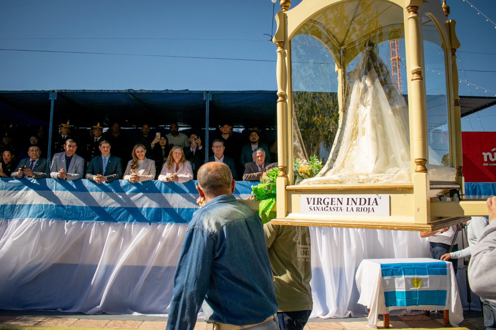 La invocación religiosa estuvo a cargo del padre Jorge Pérez, quien pidió por la paz del pueblo, invitó a elevar una plegaria de gratitud por la historia de Sanagasta y encomendó la protección del departamento a la Virgen de la Merced, patrona local.