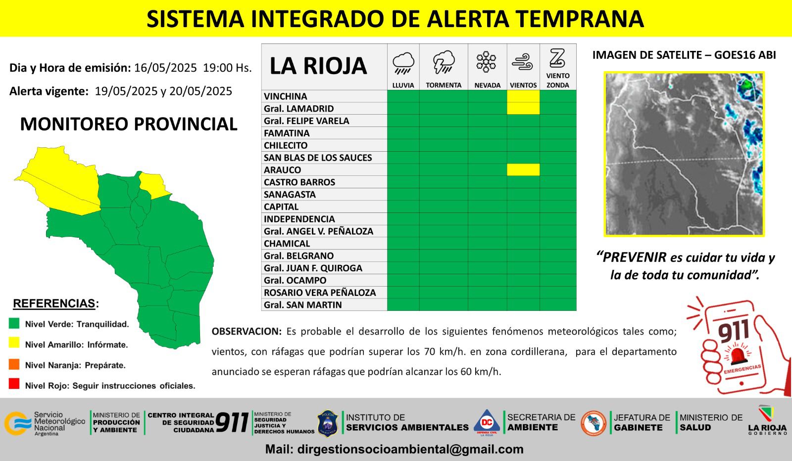 LA RIOJA.- El Comité de Emergencia emitió alerta por la probabilidad de fuertes ráfagas de vientos en la zona de los departamentos, Vinchina, Lamadrid y Arauco.