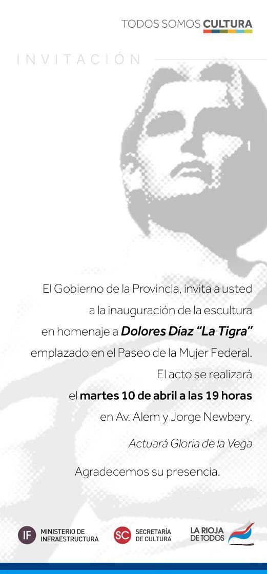 Por su rol fundamental en la historia del federalismo riojano la Secretaría de Cultura homenajeará a Dolores “La Tigra” Díaz, la Secretaría de la Mujer apoyó esta iniciativa e invita al descubrimiento de la estatua que de realizará el martes 10 a las 19 hs en la esquina de Av. Alem y Jorge Newbery.