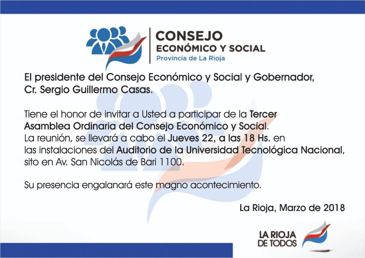 Dando cumplimento a las directivas vertidas por el gobernador Sergio Casas, de construir un gobierno de puertas abiertas a la comunidad, este jueves se celebrará la tercera Asamblea Ordinaria del Consejo Económico y Social, una herramienta de política pública para el diálogo participativo. En la oportunidad, se debatirá sobre el proyecto de transferencia del Instituto de Formación Policial, a la órbita del Ministerio de Educación.