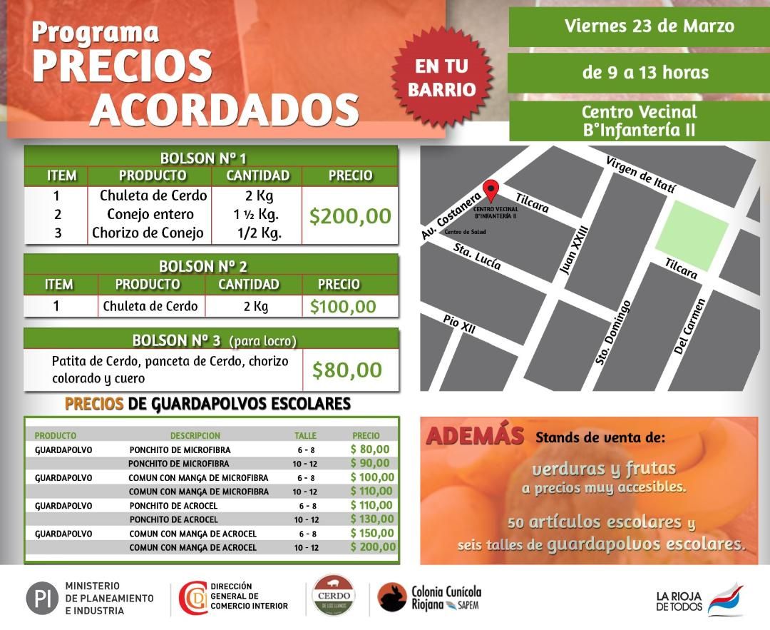 Este viernes 23, de 9 a 13, los vecinos del barrio Infantería II y de zonas aledañas tendrán la oportunidad de adquirir carnes de cerdo y de conejo de excelente calidad a precios accesibles. Las ofertas incluyen tres tipos de bolsones. El primero costará 200 pesos y consta de dos kilos de carne de cerdo, un kilo y medio de conejo entero y medio kilo de chorizo de conejo; el segundo bolsón tendrá un valor de 100 pesos e incluye dos kilos de chuleta de cerdo, mientras que la última opción se venderá a 80 pesos con un contenido de patitas y panceta de cerdo, chorizo colorado y cuero.